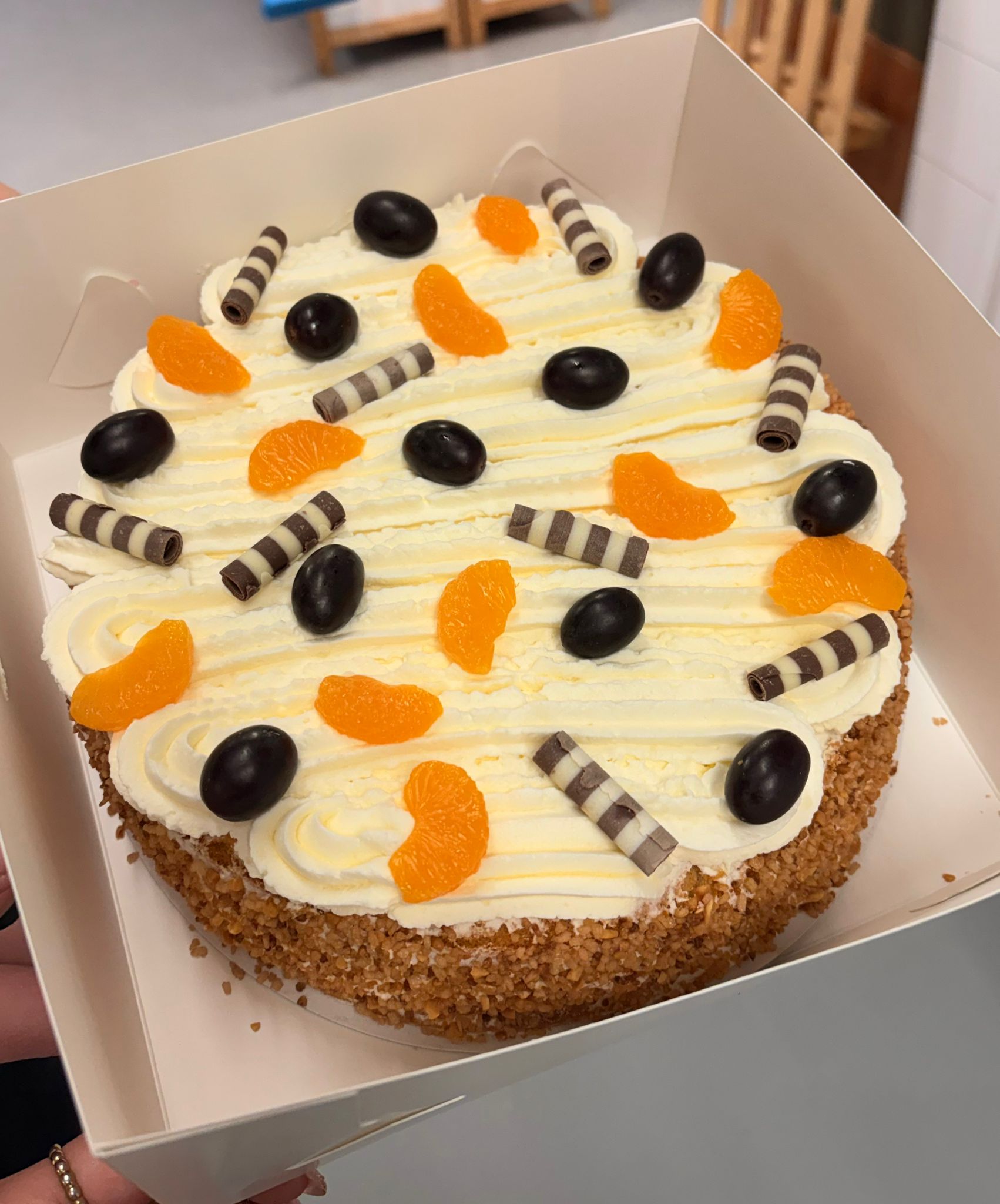 Vers gebakken met luchtige biscuit, romige slagroom en een topping van fruit en chocolade.
