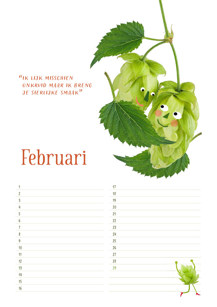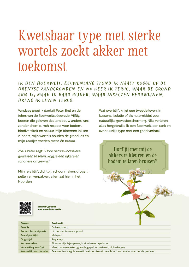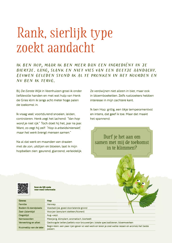 Elke maand speelt een gewas de hoofdrol. Met op de voorkant een prachtige illustratie en op de achterkant een ‘gewas-contactadvertentie’ vol persoonlijkheid en praktische info. Denk aan zaaiperiodes, oogsttijden, toepassingen en een QR-code die je zo naar de wereld van de teler en het product leidt.