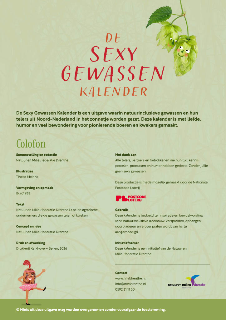 De sexy gewassen kalender is een uitgave waarin natuurinclusieve gewassen en hun telers uit Noord-Nederland in het zonnetje worden gezet. Deze kalender is met liefde, humor en veel bewondering voor pionerende boeren en kwekers gemaakt. Het is een initiatief van de Natuur- en Milieufederatie Drenthe.