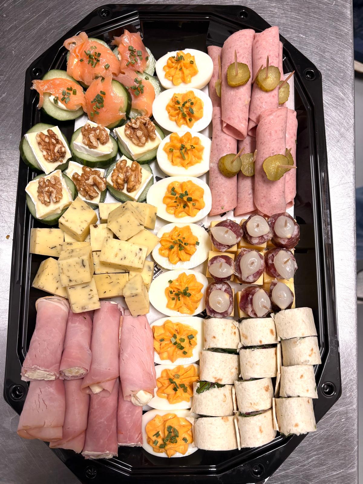 Borrelschaal met diverse luxe hapjes, voor ongeveer 10 personen. Deze borrelschaal is luxer en uitgebreider dan de borrelschaal basis.